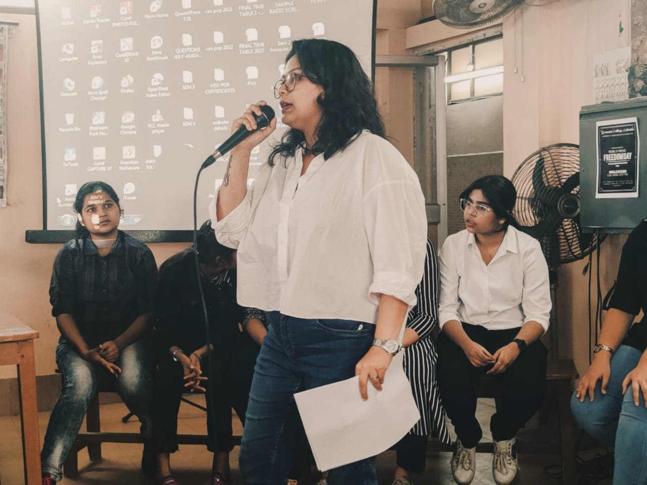 (i) Industry Interaction: Senior television journalist interacting with students (ii) Principal, Dr. Mahua Das, presenting trophies to the winners of the annual quiz competition